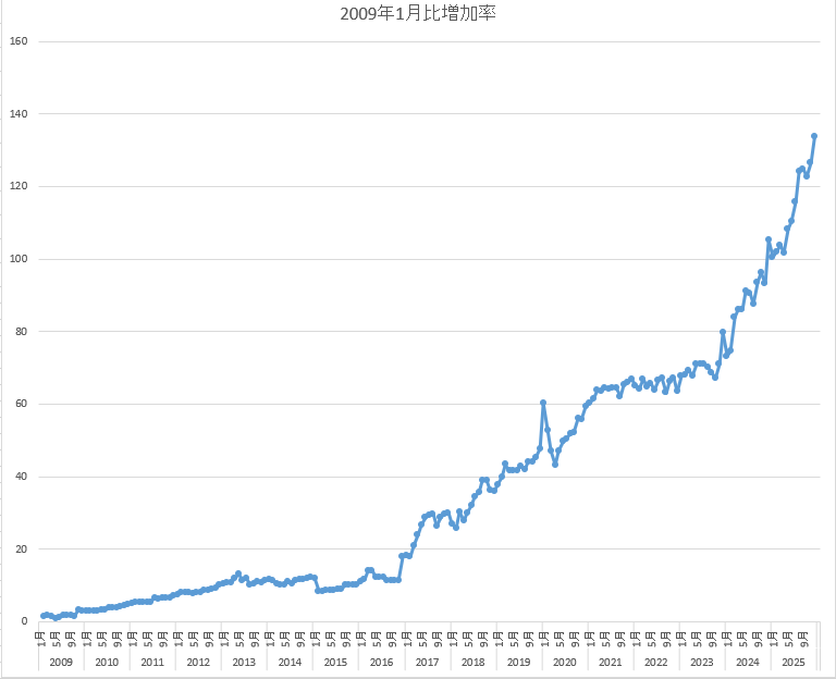 前年同月比で見てみると、ちょうどマイホーム購入したときには頭金などで使った関係で前年同月比割れを経験しているようですが、それ以外は基本的に増えてますね。