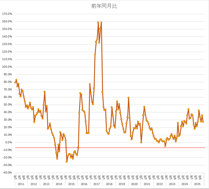 遊びがてら、さきほどは2009年比での推移ですが、前年同月比でグラフを作ってみました。